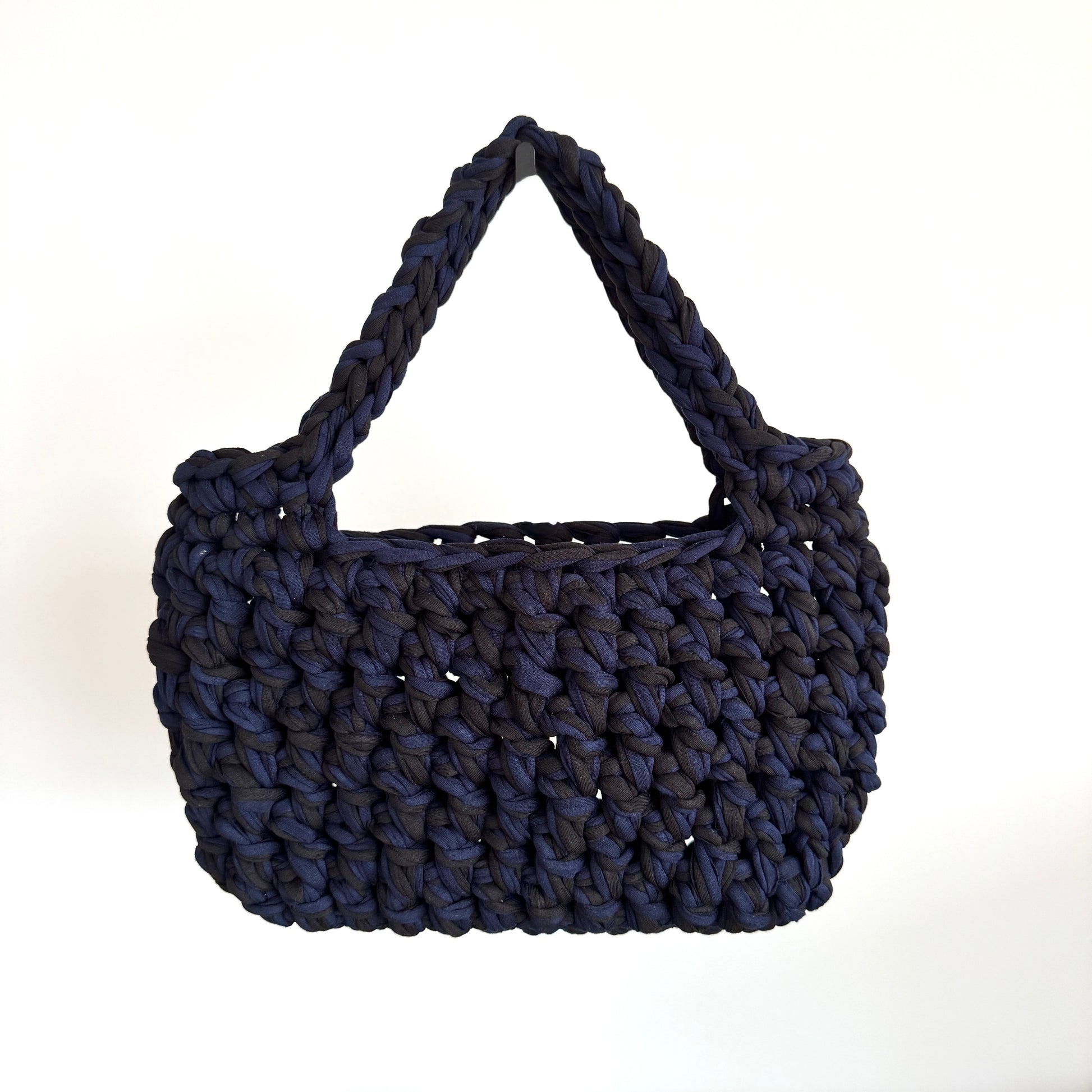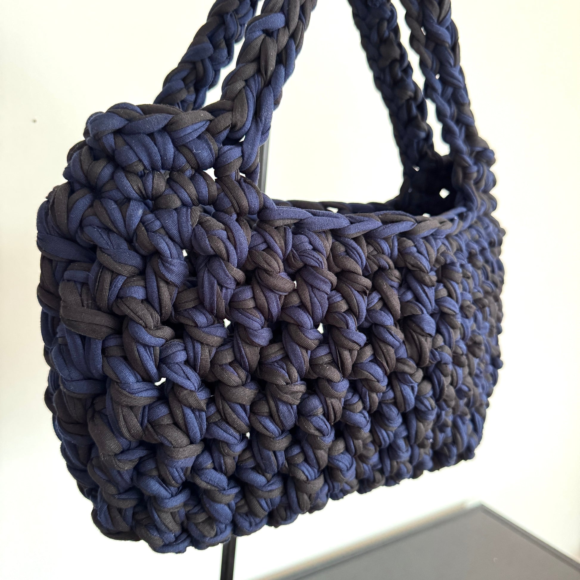 Da alle Taschen aus recyceltem Textilgarn gehäkelt werden, können bestimmte Farben nur einmal verfügbar sein. Sobald dieses Unikat verkauft ist, ist es nicht nachbestellbar – dafür entstehen regelmäßig neue Designs.