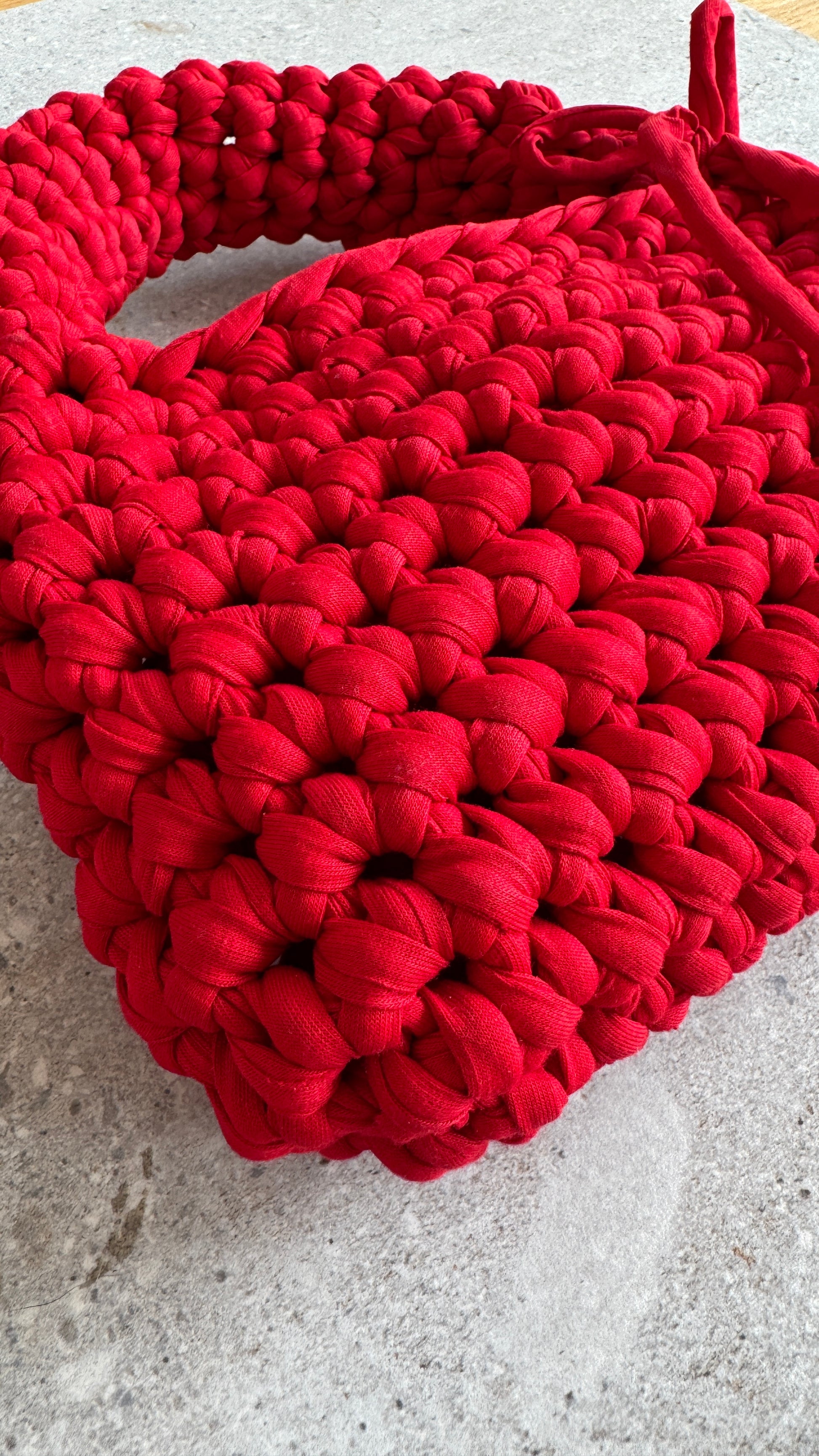 Da alle Taschen aus recyceltem Textilgarn gehäkelt werden, können bestimmte Farben nur einmal verfügbar sein. Sobald dieses Unikat verkauft ist, ist es nicht nachbestellbar – dafür entstehen regelmäßig neue Designs.